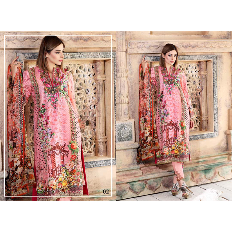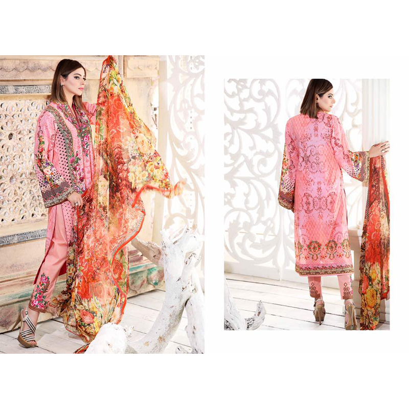 Digital Print Pink Lawn 3 Piece Unstitched Suit with an amazing color contrast of White, Black and Multi-shaded. Digital Floral printing on front and back with an additional embroidered work on Daman and Neckline. Dupatta is the combination of multicolor contrast (pink, black, white and orange). Dyed Trouser with Embroidered Patch and Crinkle Chiffon Dupatta.