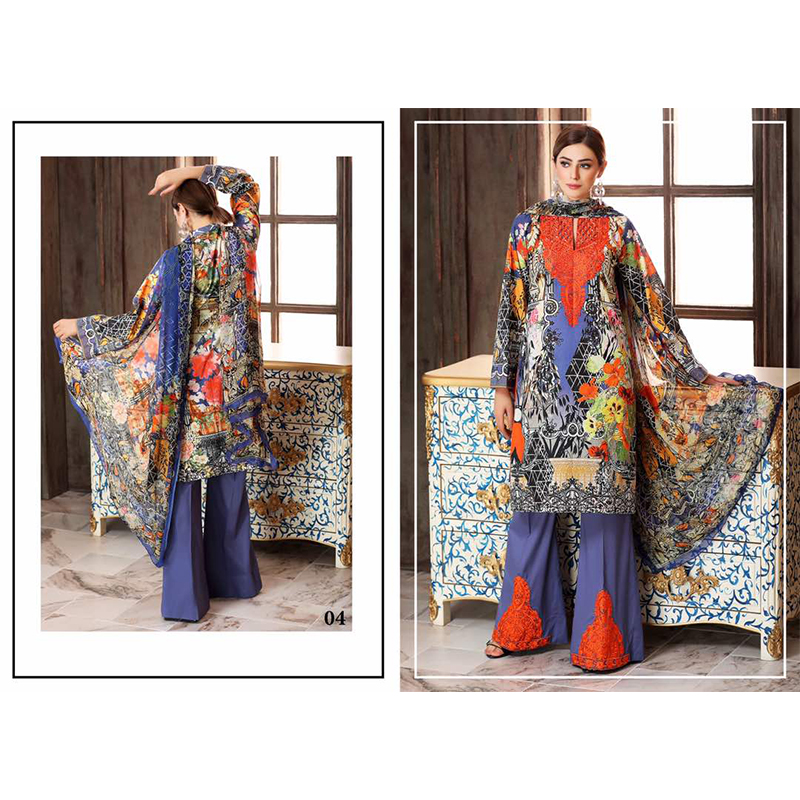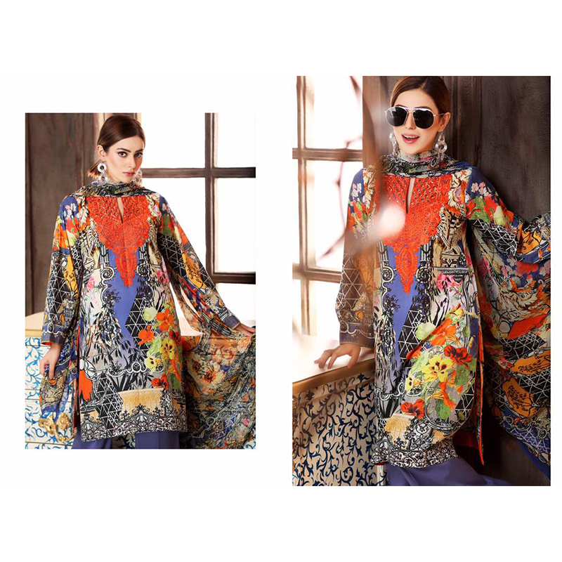 Monochrome Shirt with Royal Blue and Multicolor contrast gives a perfect look in any ambience of lifestyle. A defined Digital Print Lawn Suit with alluring and vibrant shades with orange embroidered work on Neckline and Trouser. This Orange embroidered work is looking adorable on Blue and Multi Shades. The Crinkle Chiffon Dupatta with Digital Print Lawn will look perfect on this Eid.