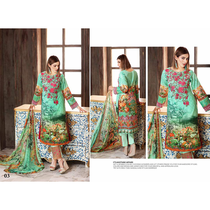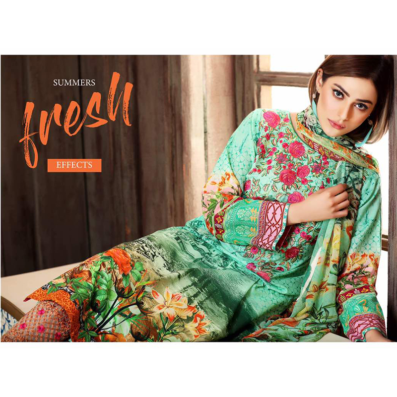 The exclusive Digital Print Lawn Collection 2017 is ready to brighten your summer 2017 as well Eid 2017 look with the Turkish Green color that is beautifully designed by the Zarmeeney's clothing expertise. These are much competent to deliver the best and stylish clothing wear according to seasonal demand. In Summer, the most demanding fabric is Lawn and Zarmeeney's digitally printed the new floral design on Lawn Suits to make you beautiful and adorable. The floral work on Digital Print Lawn Shirt enhances the beauty and appearance of the suit. The design and color of Dupatta much resemble with the shirt's design and color contrast. It is the first edition of Zarmeeney's clothing brand, and the demand of the Digital Print Lawn Collection is increasing day by day as it offers the attractive designs and fascinating color scheme. The fabric of products is Lawn and offers the design of 3 Piece unstitched. The detail description of suit is as followed;